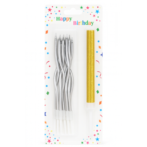 Ідеальний варіант для яскравого та стильного декору торта! У наборі — фігурні металізовані свічки та велика золота свічка-феєрверк, які створюють вау-ефект на святі.